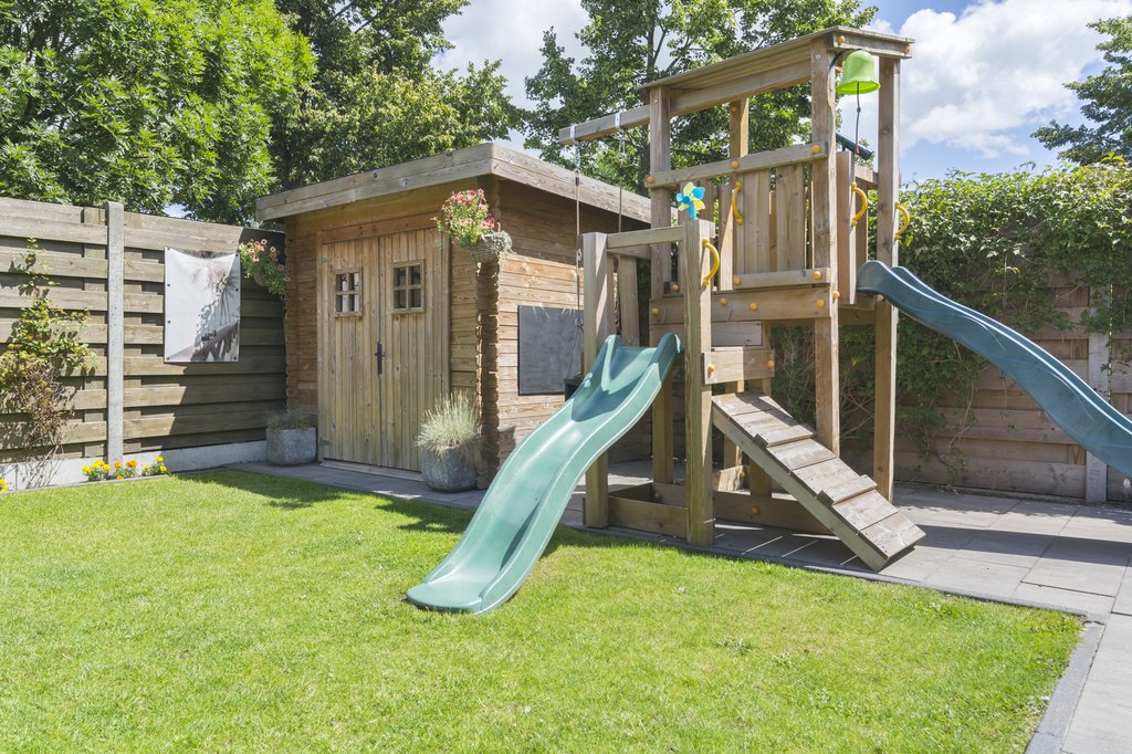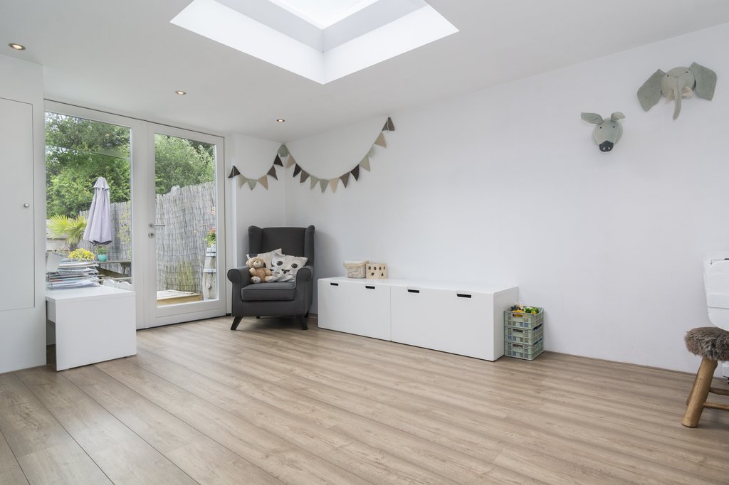 De speelkamer (voormalige garage) (ca. 16m²) met laminaatvloer en strak gestuukte wanden is voorzien van een lichtkoepel, een vaste kast en dubbele tuindeuren. Vanuit de speelkamer is de berging te bereiken.