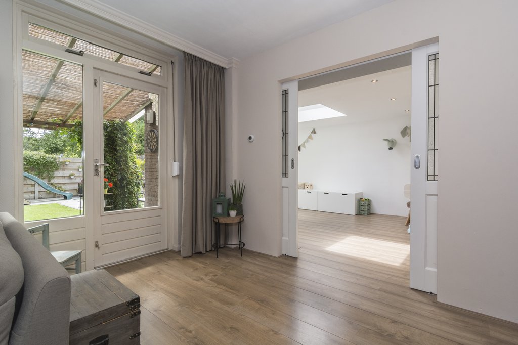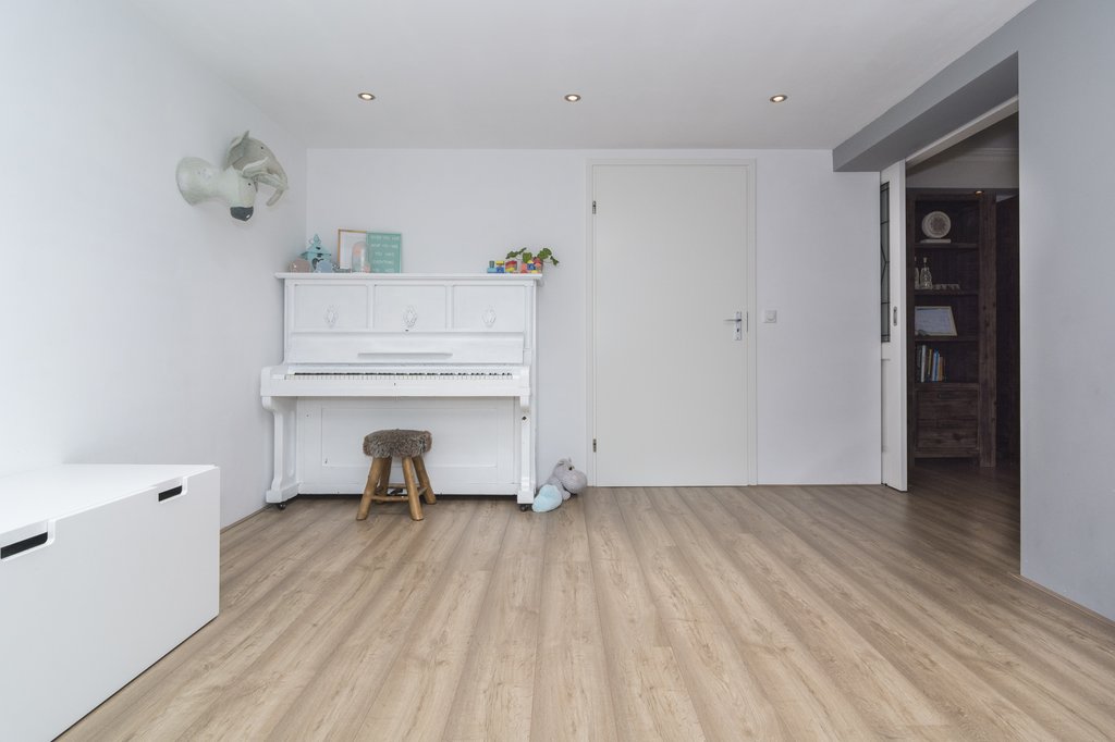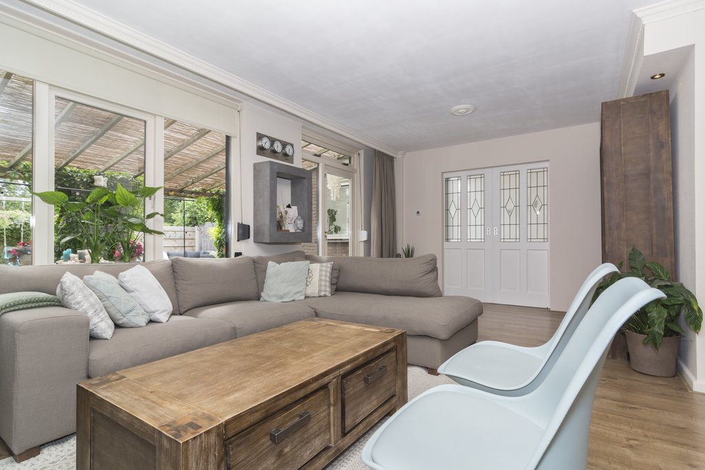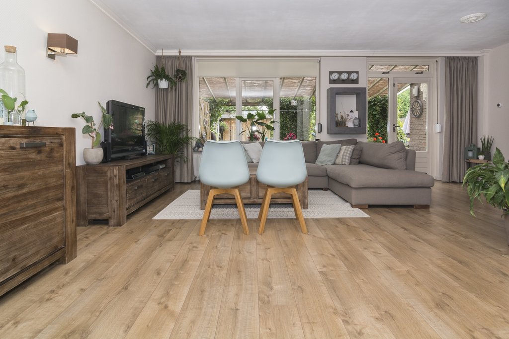 De ruime en sfeervolle woonkamer (ca. 45m²) met laminaatvloer en glasvliesbehang is voorzien van een open keuken en geeft middels en-suite deuren toegang tot de speelkamer. Middels een loopdeur is de tuin te bereiken.