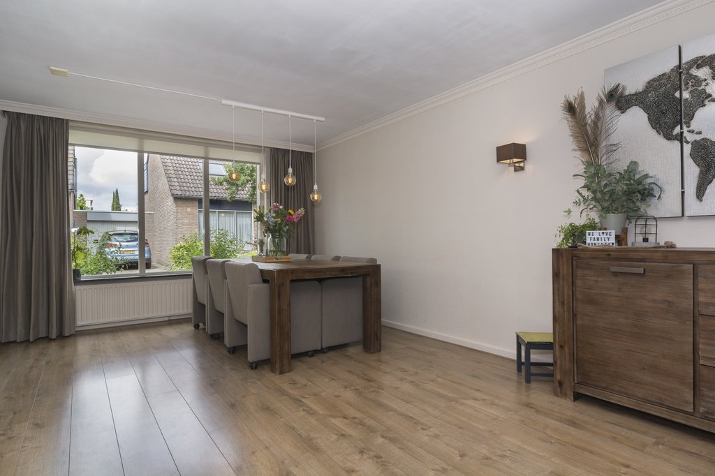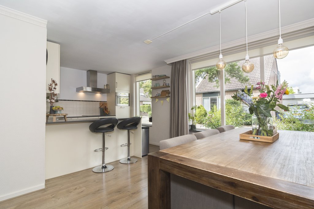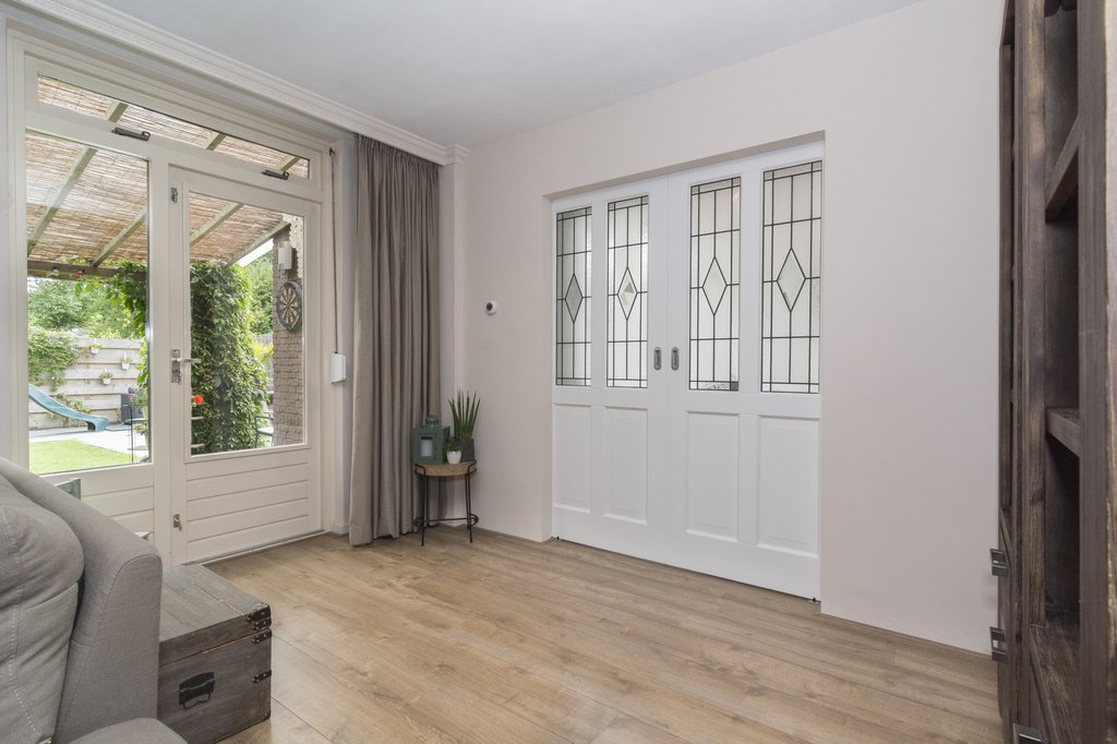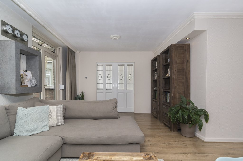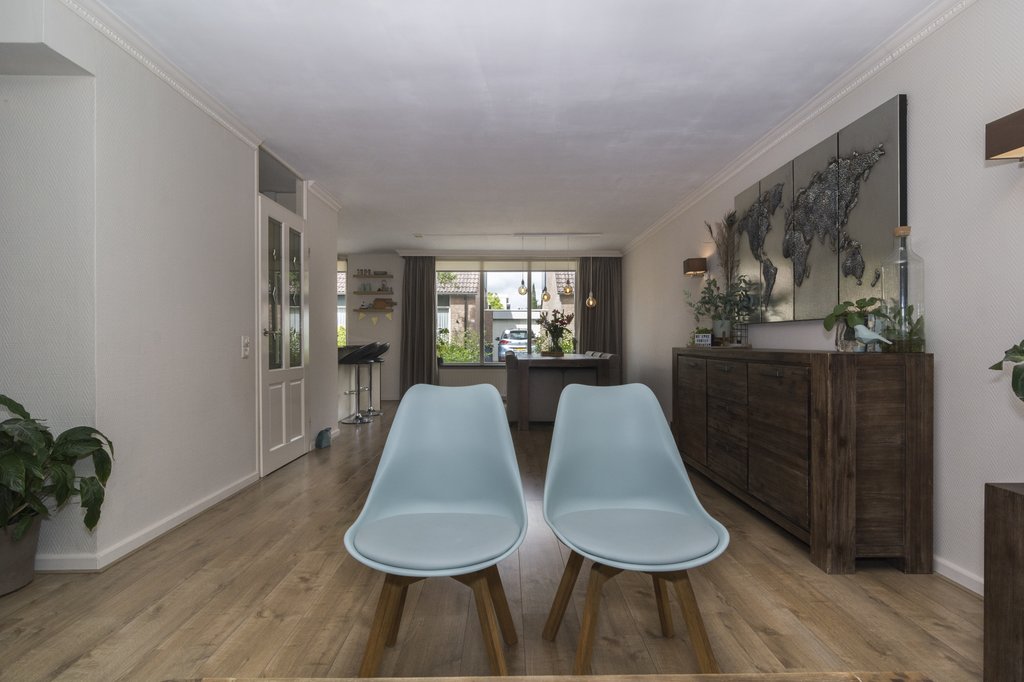 De ruime en sfeervolle woonkamer (ca. 45m²) met laminaatvloer en glasvliesbehang is voorzien van een open keuken en geeft middels en-suite deuren toegang tot de speelkamer. Middels een loopdeur is de tuin te bereiken.