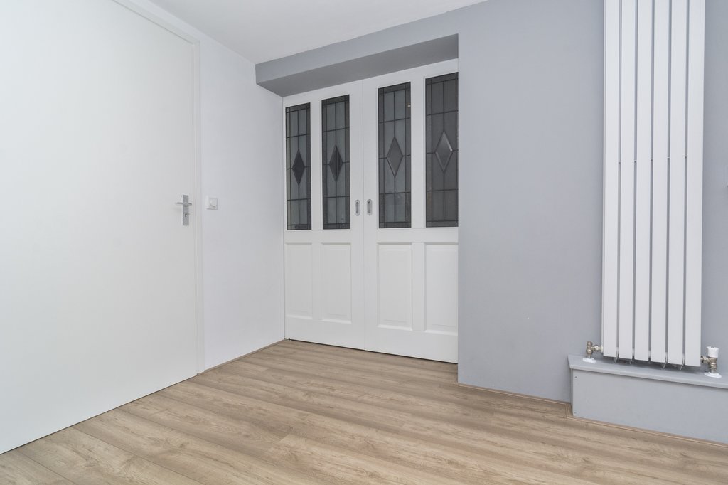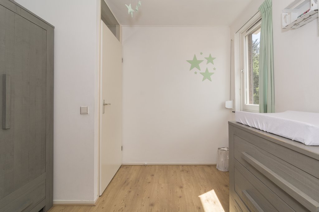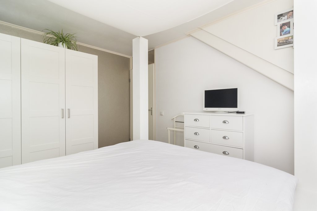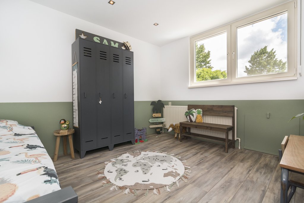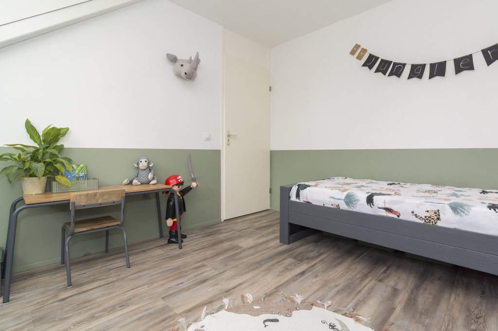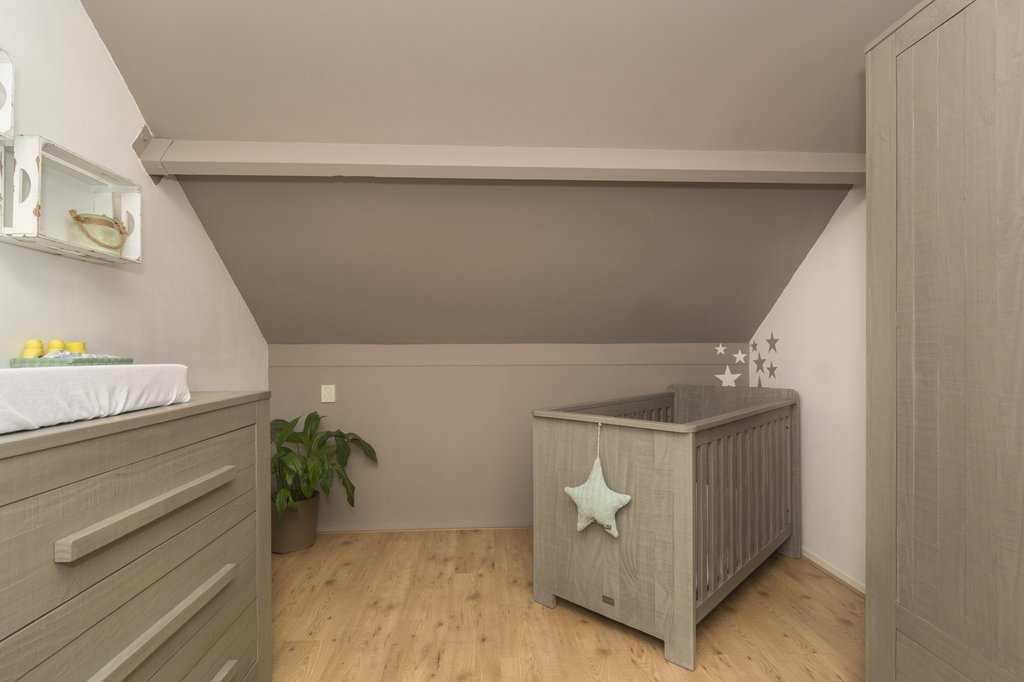Slaapkamer 2: (ca. 11m²) gelegen aan de voorzijde en voorzien van laminaatvloer, strak gestuukte wanden en bergruimte achter knieschotten.