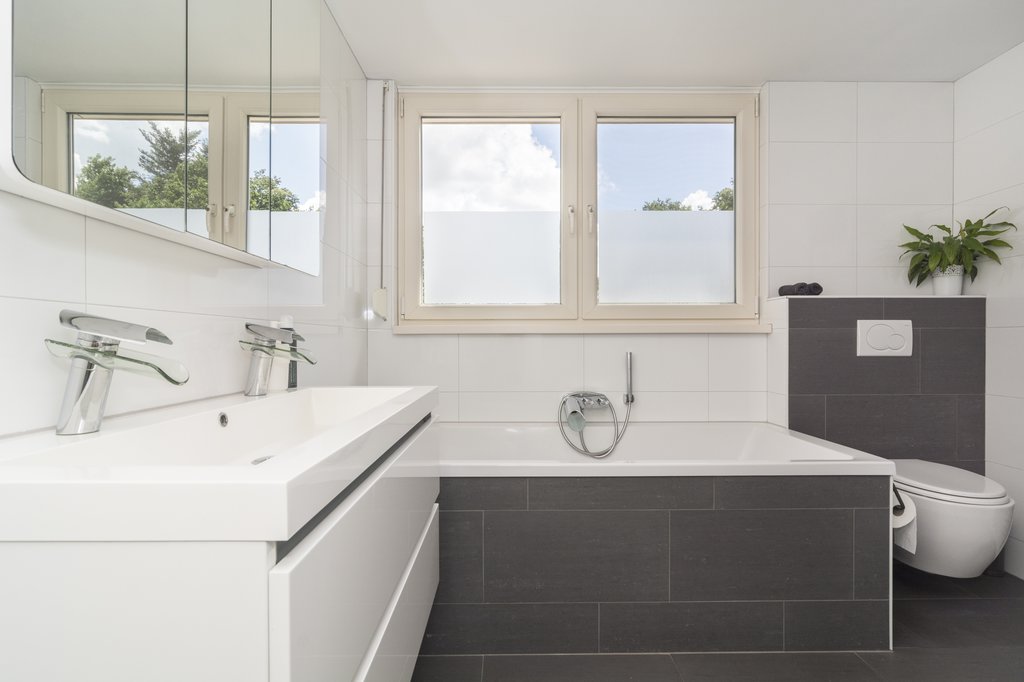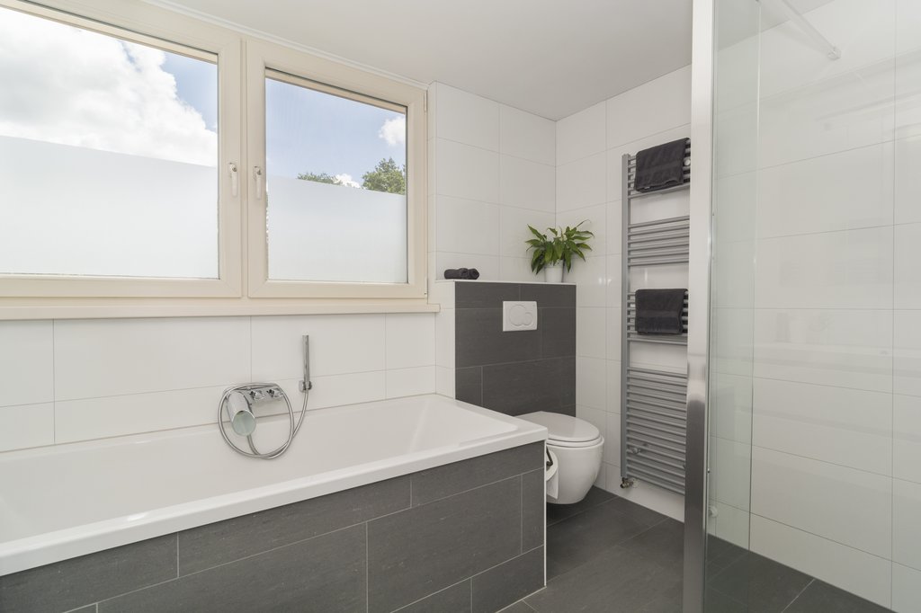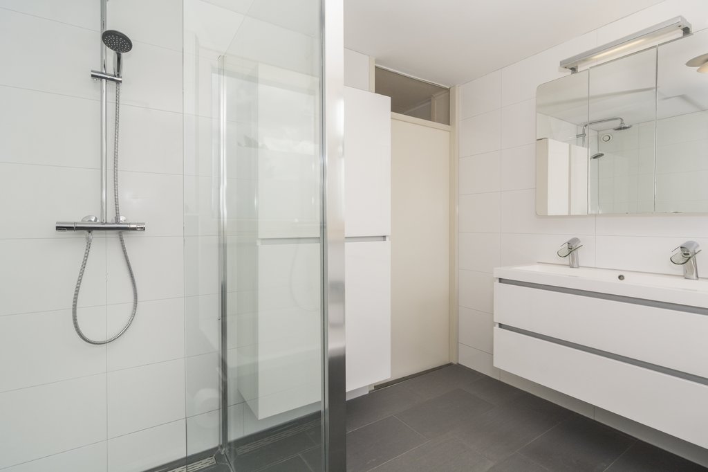Badkamer: (ca. 7m²) luxe en volledig betegeld met een inloopdouche, ligbad, badmeubel met dubbele wastafel, toilet, handdoekradiator en een dakkapel.