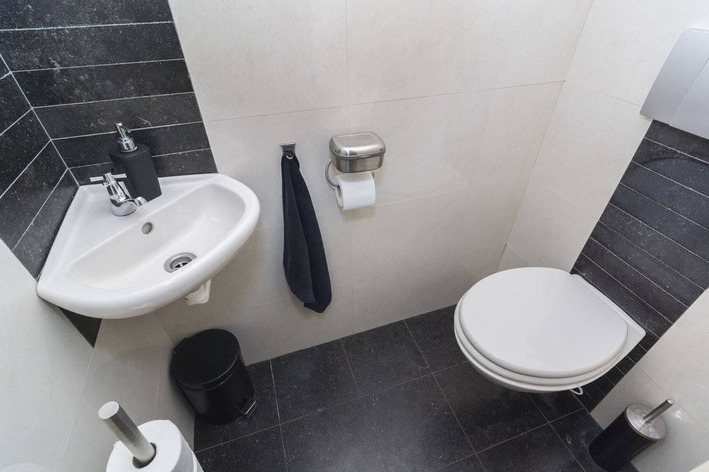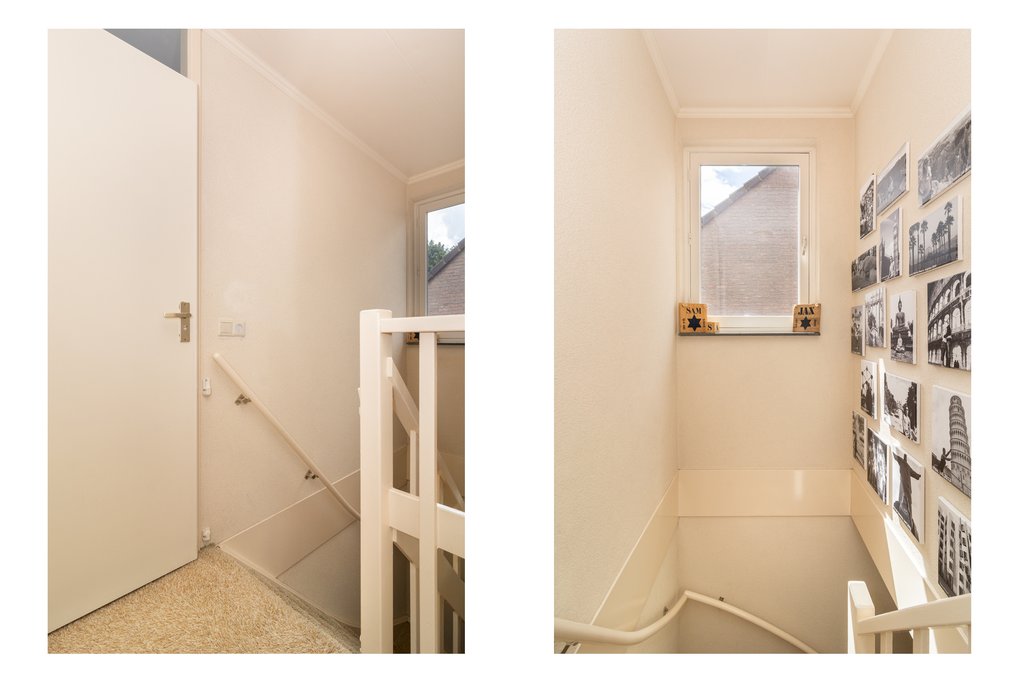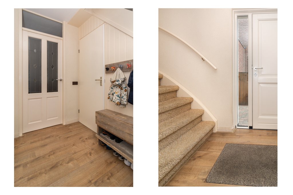 Vanuit de oprit bereik je de entree met laminaatvloer en spachtelputz wanden. In de hal bevindt zich de moderne en volledig betegelde toiletruimte voorzien van hangcloset en fonteintje, de meterkast (10 groepen + 1 aardlekschakelaar), trapopgang naar de verdieping en geeft toegang tot de woonkamer.