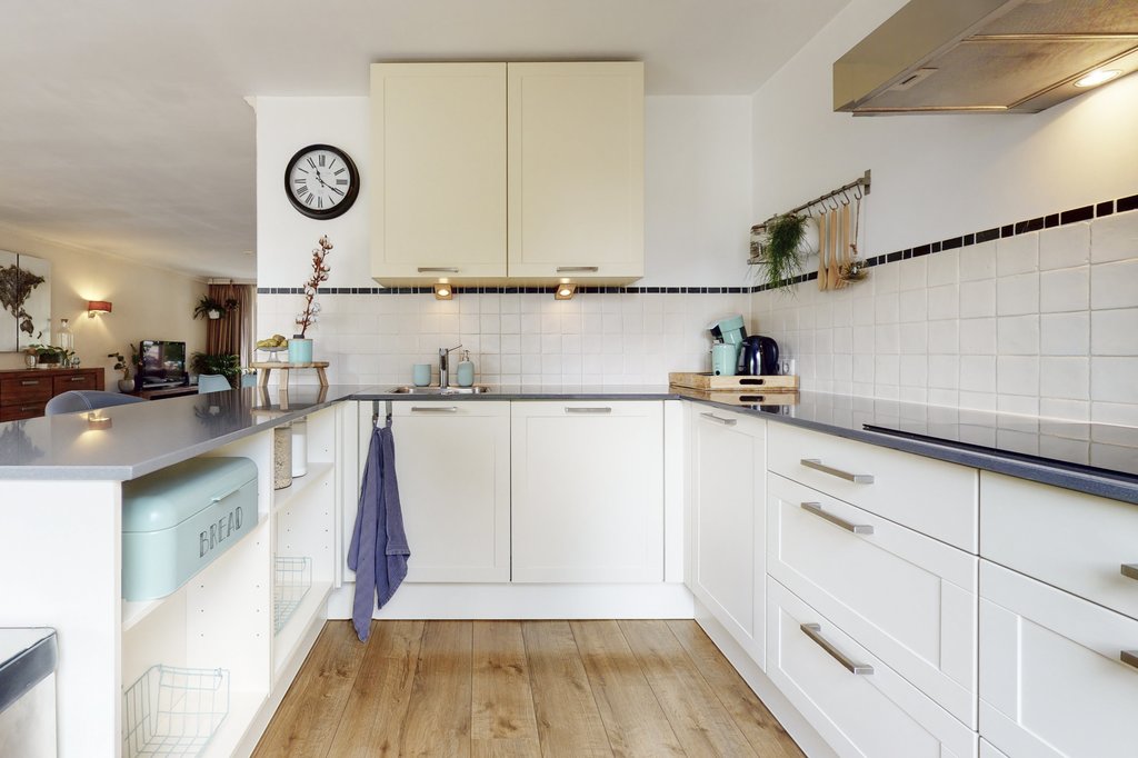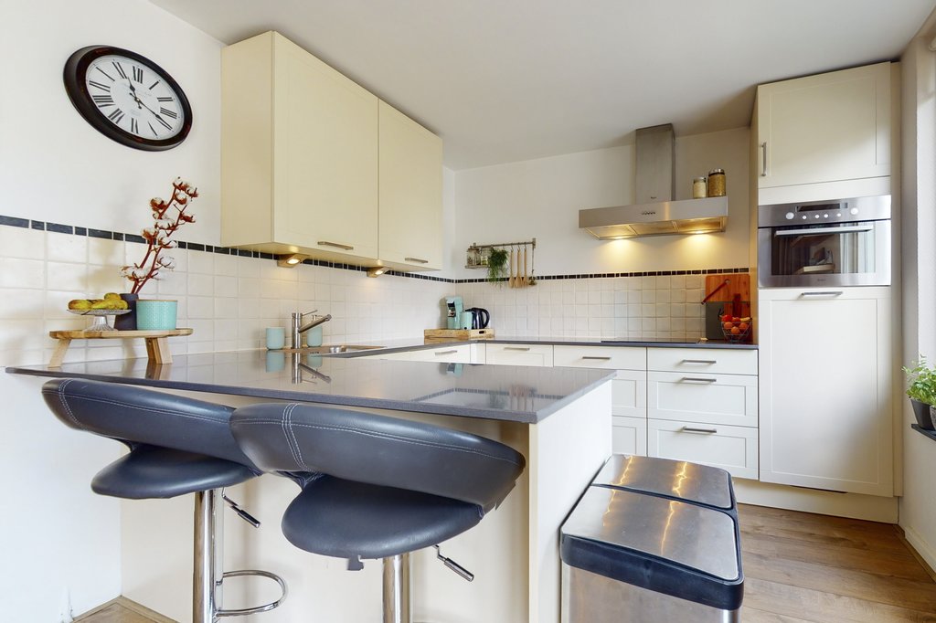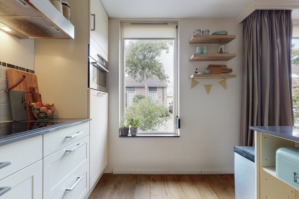 De moderne open keuken met U-opstelling is gelegen aan de voorzijde van de woning en ingericht met een granieten werkblad en voorzien van rvs spoelbak, inductiekookplaat, afzuigkap, vaatwasser, oven en een koelkast.