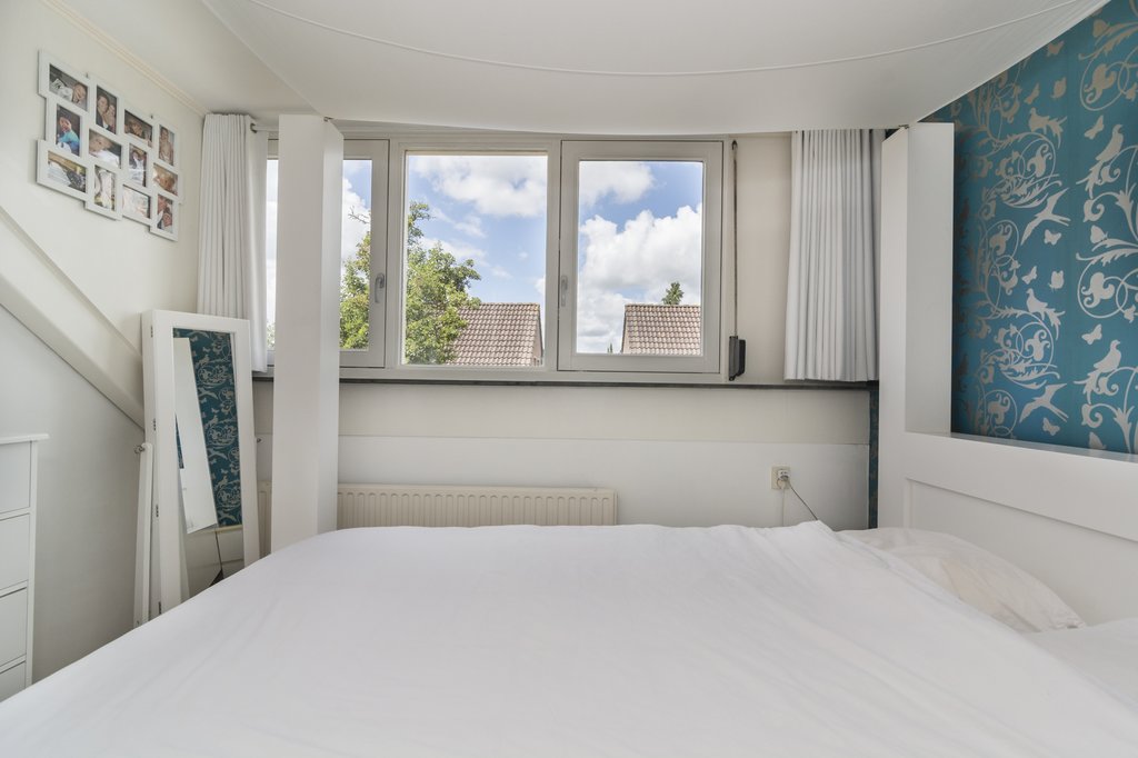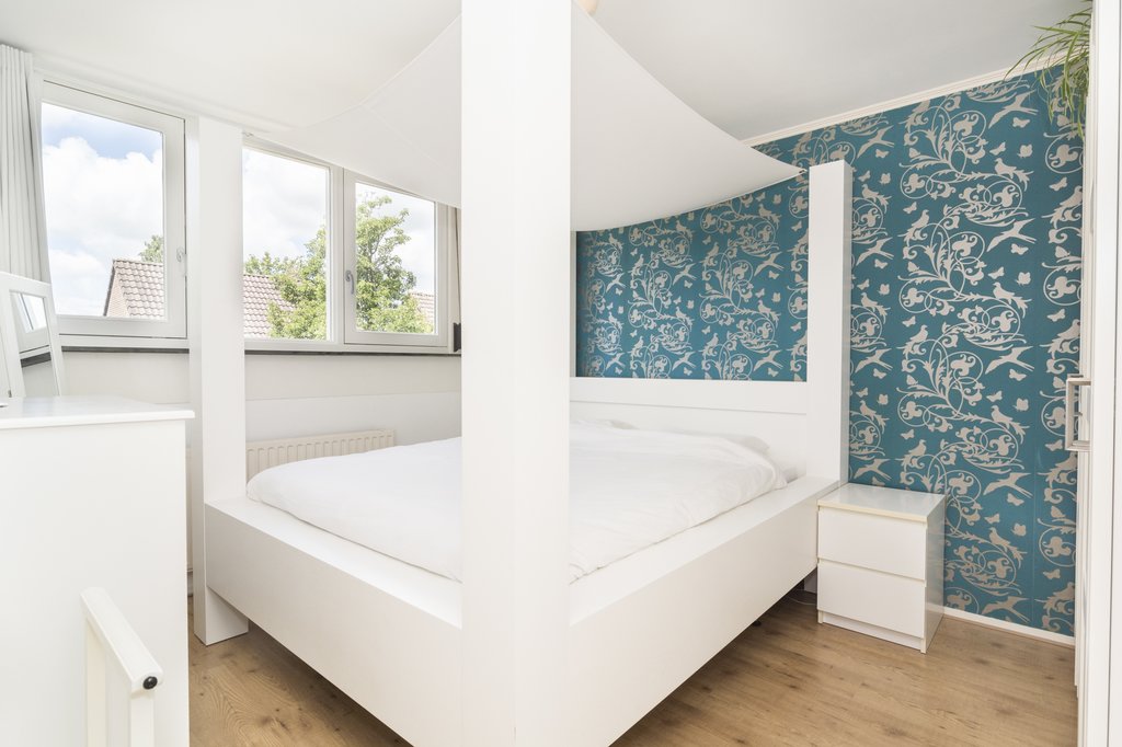Slaapkamer 1: (ca. 12m²) gelegen aan de voorzijde en voorzien van laminaatvloer, strak gestuukte wanden, decoratiebehang en een dakkapel met rolluik.