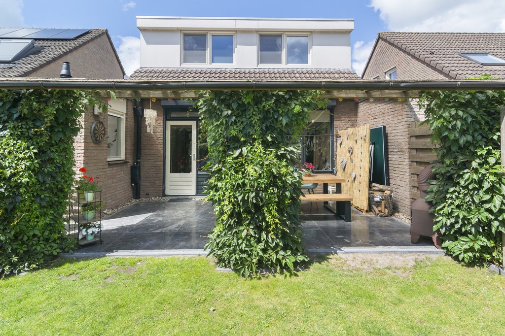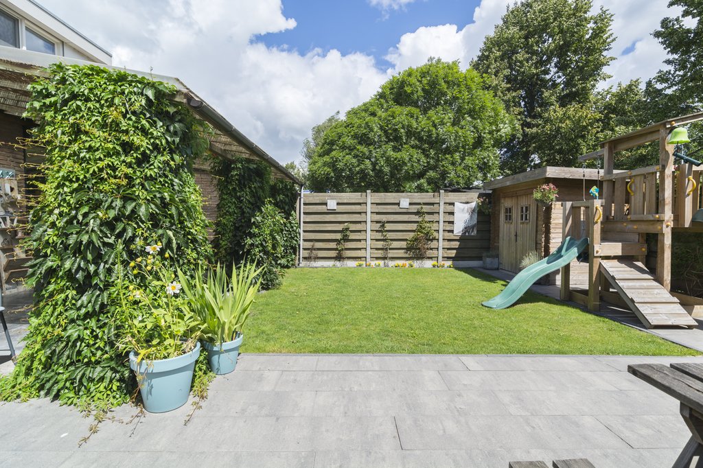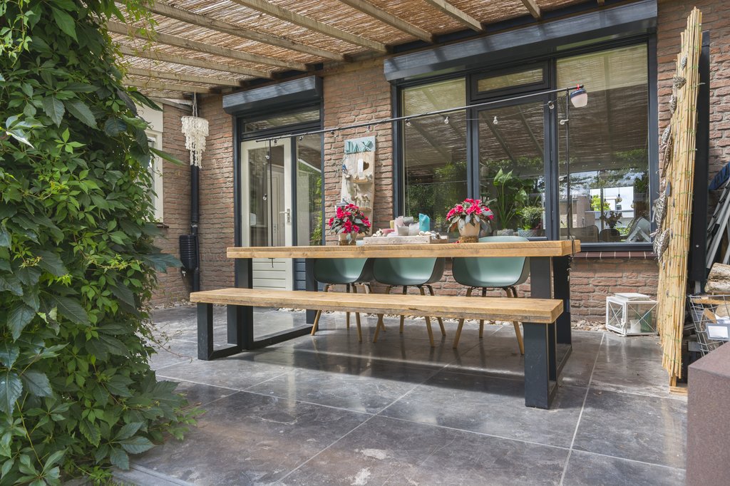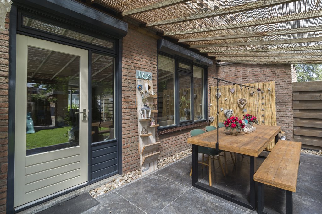 De sfeervolle achtertuin (ca. 109m²) gelegen op het oosten is voorzien van een royale terrasoverkapping (ca. 25,5m²), terrassen, gazon, solide erfafscheiding en een berging (ca. 4m²).