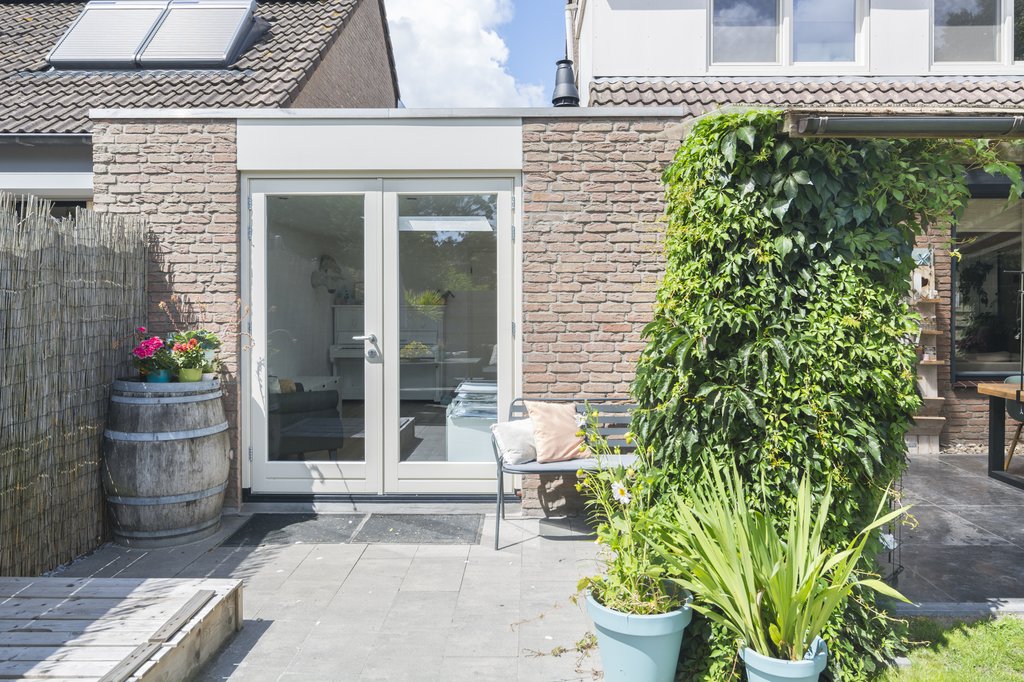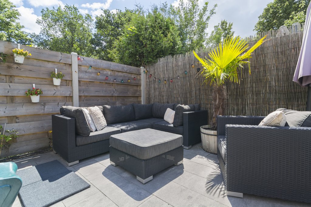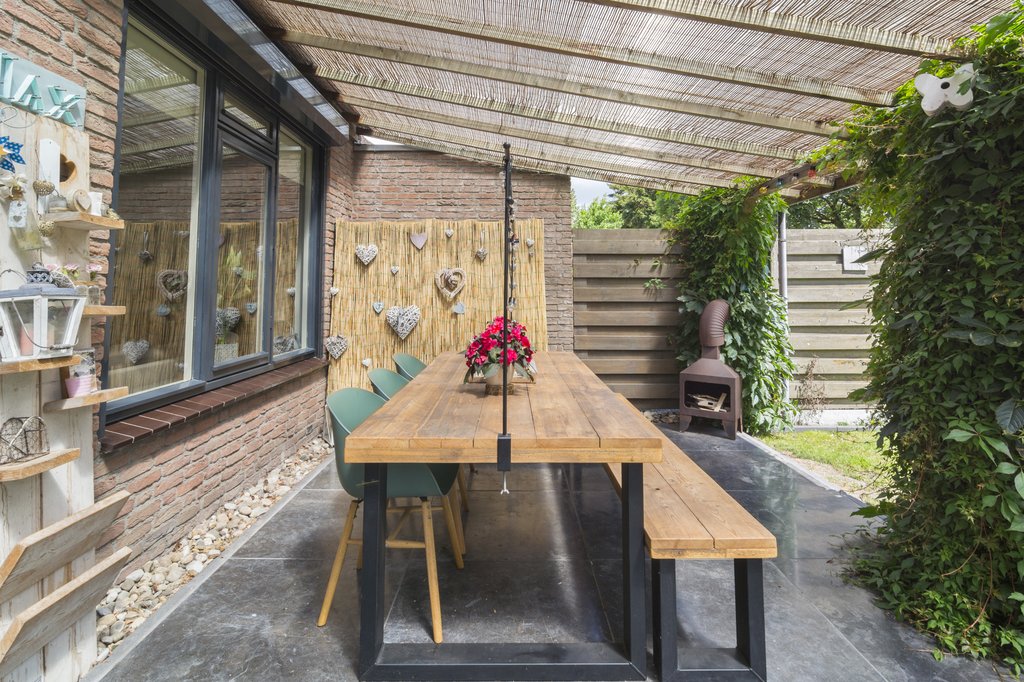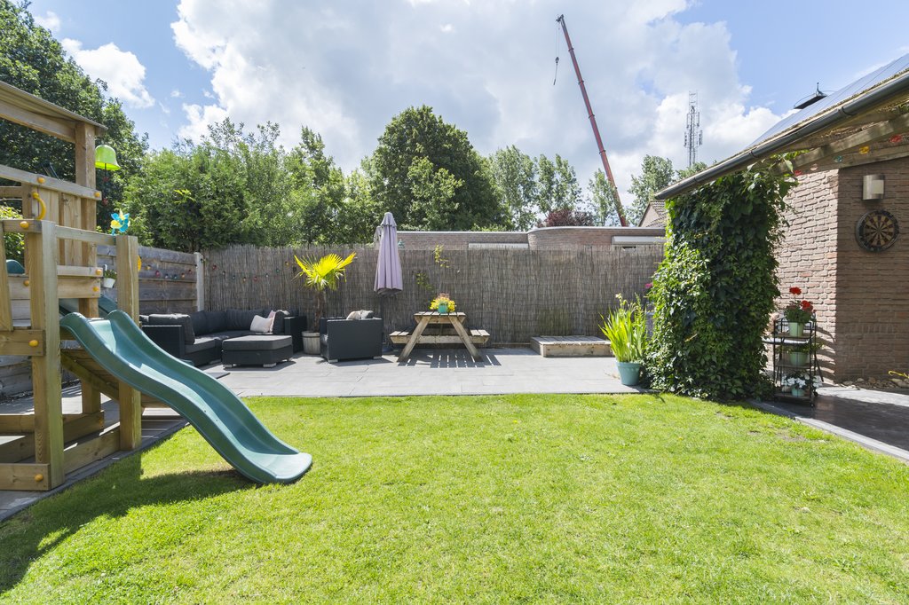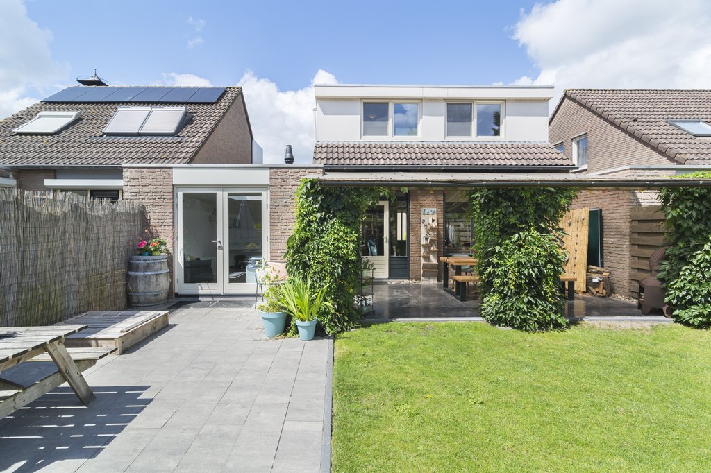De sfeervolle achtertuin (ca. 109m²) gelegen op het oosten is voorzien van een royale terrasoverkapping (ca. 25,5m²), terrassen, gazon, solide erfafscheiding en een berging (ca. 4m²).