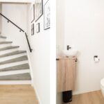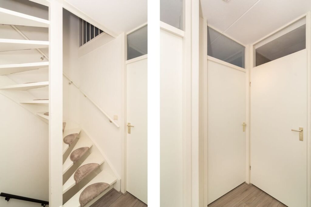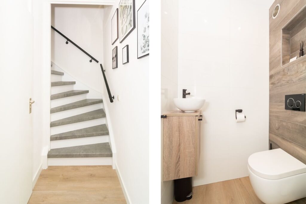 Vanuit de woonkamer heb je via de openslaande kunststof tuindeuren toegang tot de achtertuin en toegang tot de gesloten trapopgang. Hier bevindt zich eveneens de volledig betegelde toiletruimte met hangcloset en fonteintje.