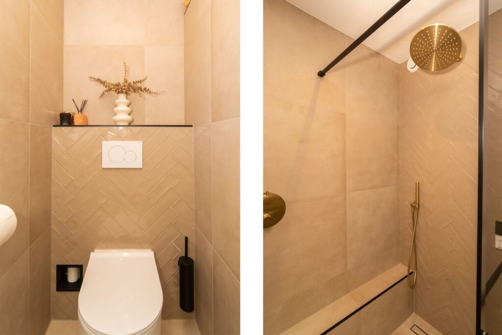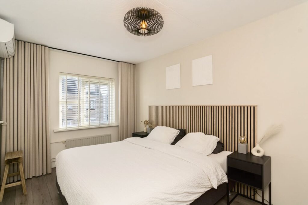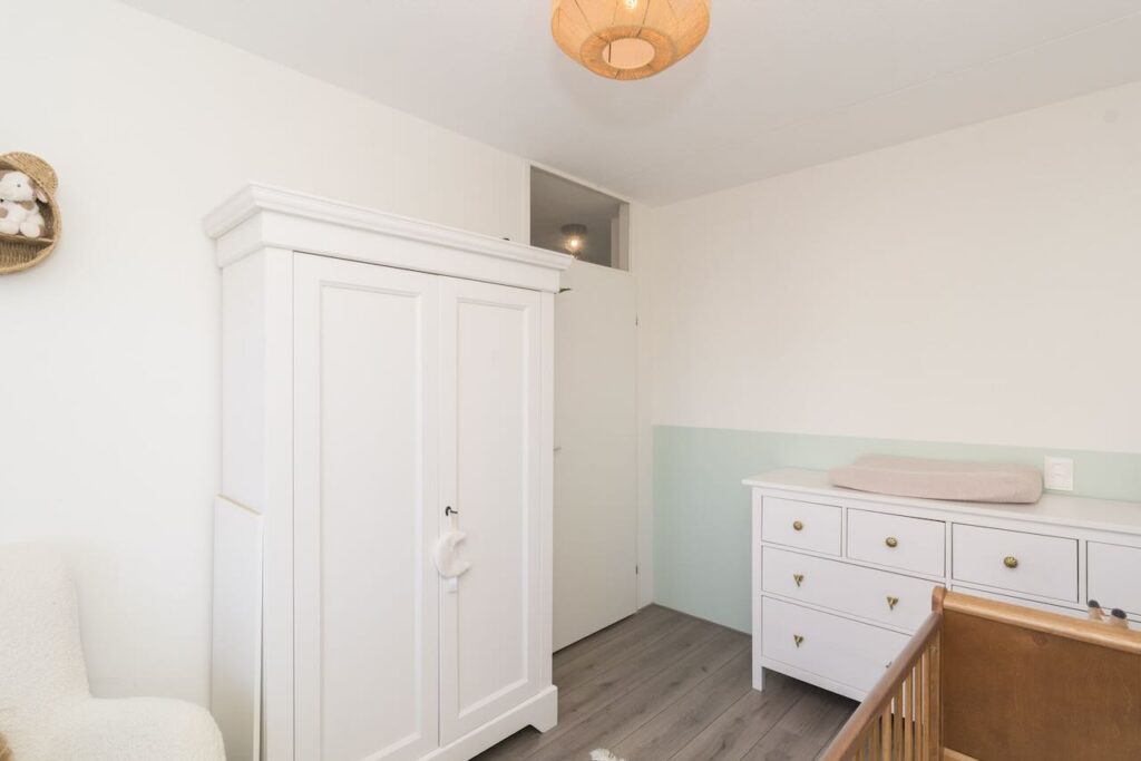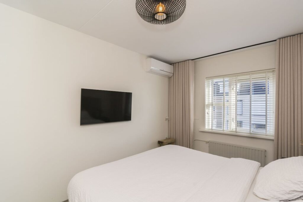 De overloop geeft toegang tot drie slaapkamers, complete badkamer en vaste trap naar de tweede verdieping. Alle slaapkamers (resp. ca. 12,8 – 9 – 7,4m²) zijn afgewerkt met laminaatvloeren, stucwerk wandafwerking en rolluiken. De slaapkamer aan de voorzijde van de woning is eveneens voorzien van airco. Moderne volledig betegelde badkamer (2023) is ingericht met een inloopdouche, badmeubel met dubbele waskom, hangcloset en mechanische ventilatie.