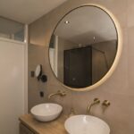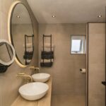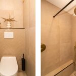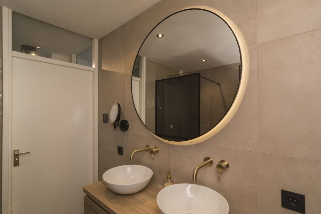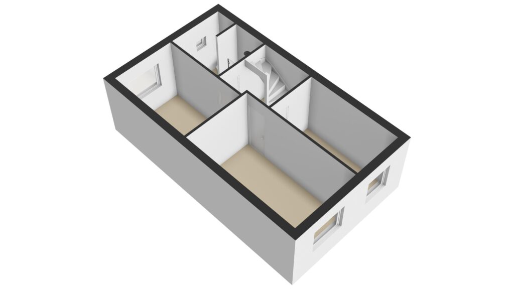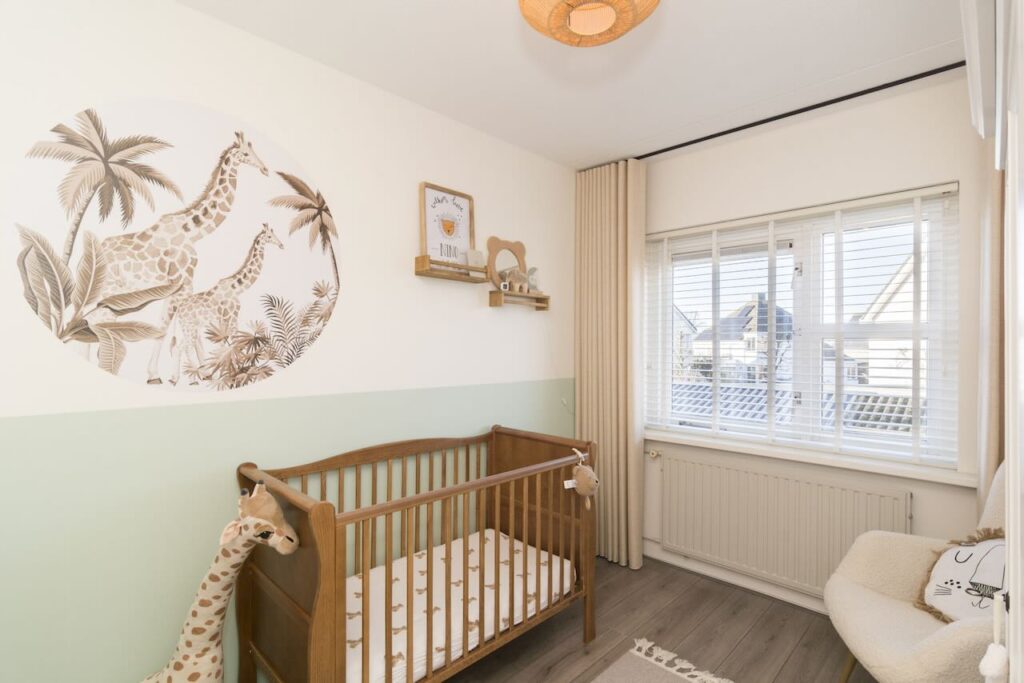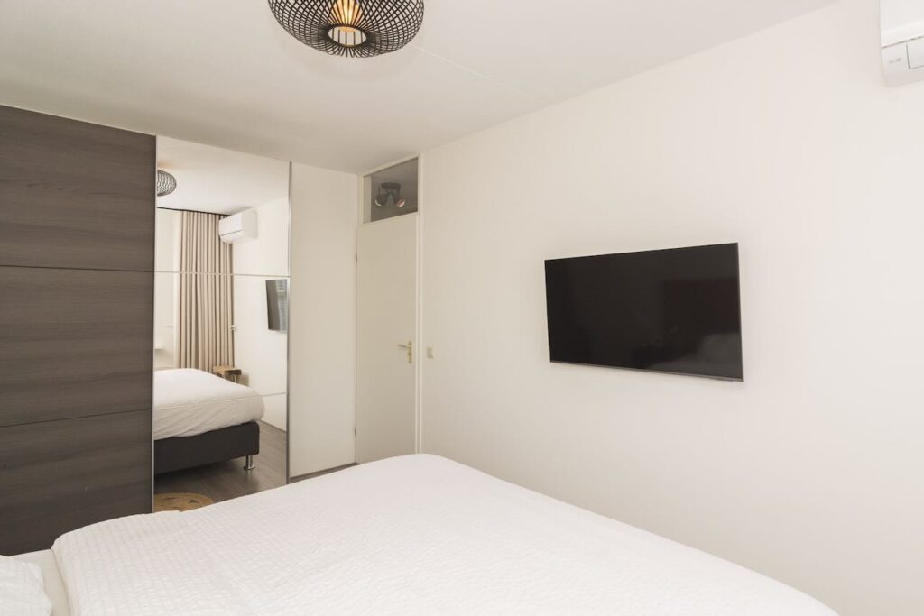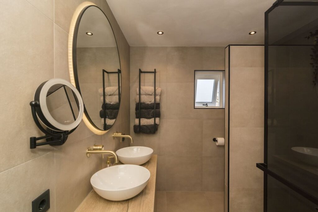 De overloop geeft toegang tot drie slaapkamers, complete badkamer en vaste trap naar de tweede verdieping. Alle slaapkamers (resp. ca. 12,8 – 9 – 7,4m²) zijn afgewerkt met laminaatvloeren, stucwerk wandafwerking en rolluiken. De slaapkamer aan de voorzijde van de woning is eveneens voorzien van airco. Moderne volledig betegelde badkamer (2023) is ingericht met een inloopdouche, badmeubel met dubbele waskom, hangcloset en mechanische ventilatie.