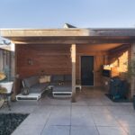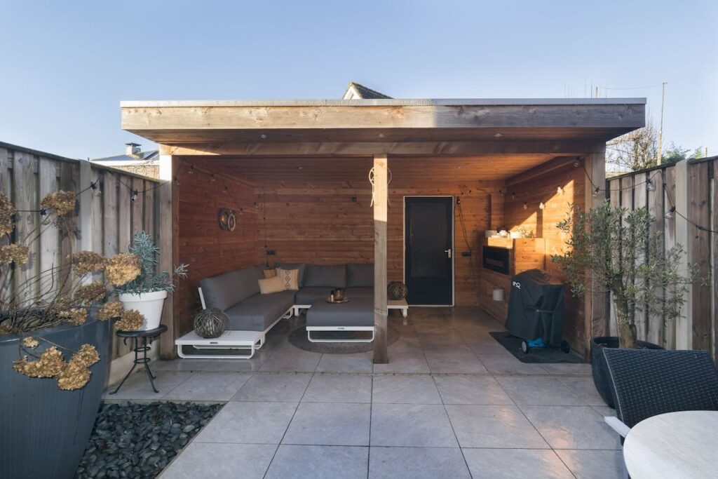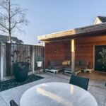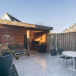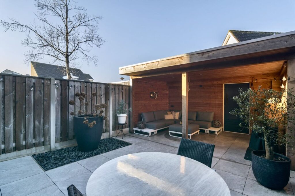De ruime tuin is gelegen op het west/zuidwest met aan de achterkant van het huis een elektrisch bedienbaar zonnescherm, modern aangelegd met terrastegels, gezellige (verwarmde) overkapping en stenen berging (4,95 x 2,71m) voorzien van elektra en een achterom.