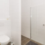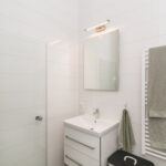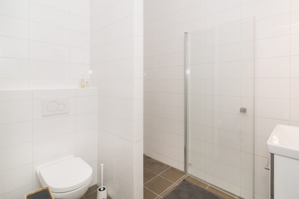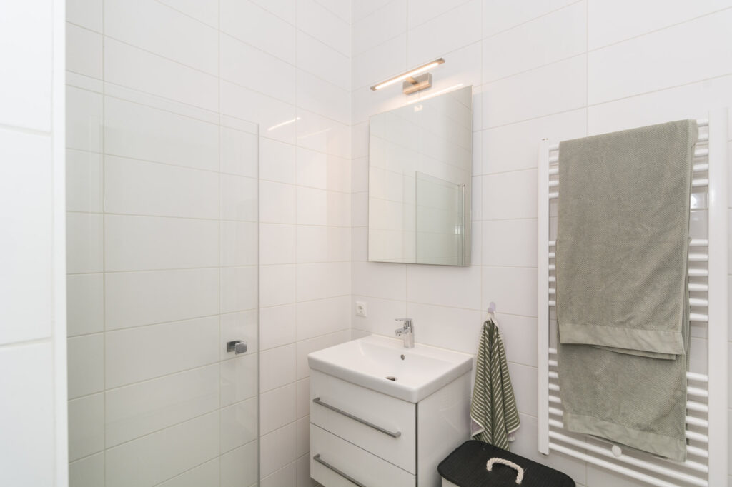 Badkamer: (ca. 4,7m2) is volledig betegeld en ingericht met hangcloset, inloopdouche, badmeubel met wastafel, en elektrische handdoekradiator.