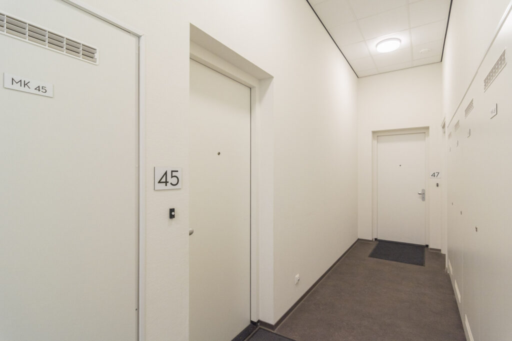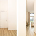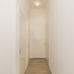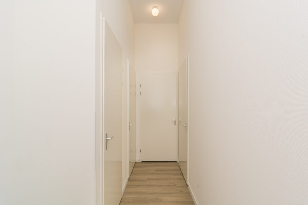 Hal/entree voorzien van pvc-vloer met vloerverwarming, glasvliesbehang wandafwerking, toegangsdeuren naar badkamer en woonkamer.