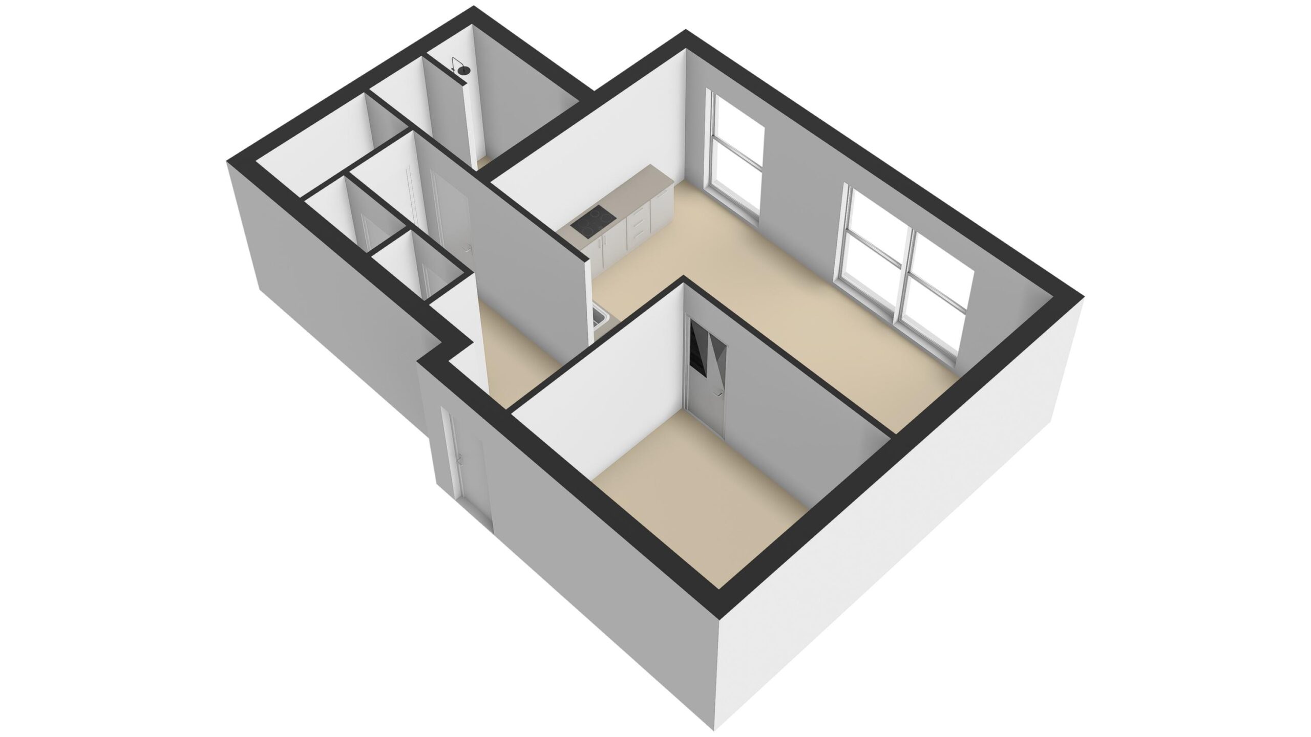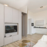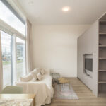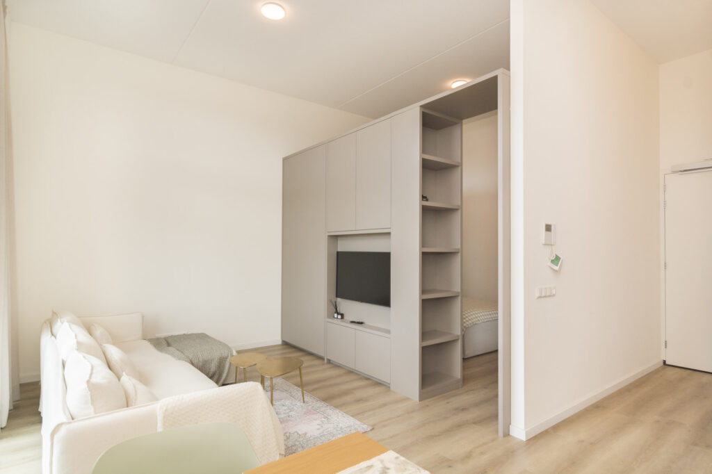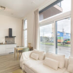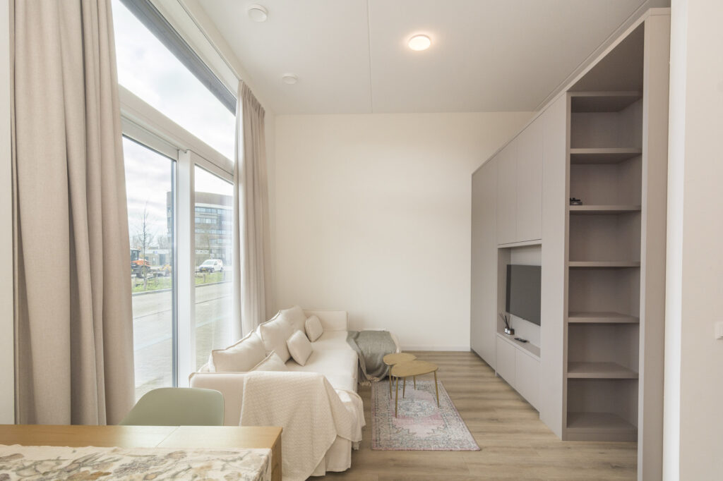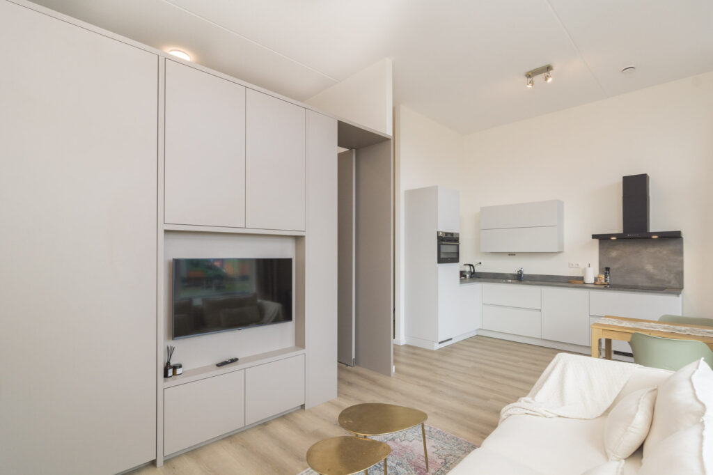 Lichte woonkamer met schuifpui voorzien van pvc-vloer met vloerverwarming, glasvlies behang wandafwerking, veel lichtinval door de hoge raampartijen (3,60 m) met elektrisch bediende screens, op maat gemaakte room devider met veel kastruimte, t.v.-uitsparing en taatsdeur naar de slaapkamer.