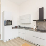 Moderne openkeuken in hoek-opstelling met kunststof werkblad, vaatwasser, spoelcentrum, inductiekookplaat, afzuigkap, koelkast en combimagnetron. Woonkamer en keuken zijn tezamen ca. 24m2 groot.