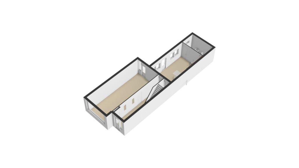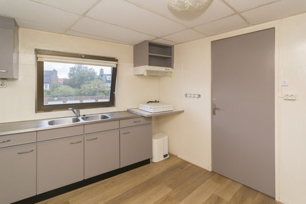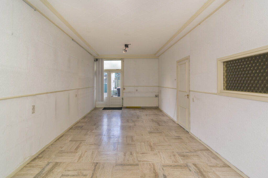 Hal/entree met Portugese tegelvloer, trapopgang naar de verdieping en toegang tot de ruime lichte woonkamer (ca. 32m²) met travertinvloer, granol wandafwerking en openslaande tuindeuren met rolluik. De royale woonkeuken (ca. 22m²) voorzien van tegelvloer en -wandafwerking, eenvoudige keukeninrichting met kunststof werkblad, gaskookplaat, afzuigkap en koelkast. Verder is er nog een deur naar de tuin, toegang tot kelderkast en badkamer. Deze badkamer is gedateerd, deels betegeld en voorzien van ligbad/douche, bidet, toilet en wastafel, ook is hier de HR cv combiketel geplaatst (Vaillant Ecotec plus, huur via Vigar).
