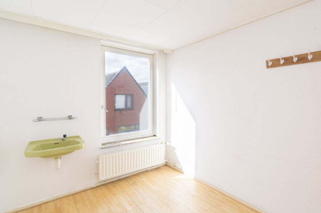Slaapkamer 3: (ca. 12m²) gelegen aan de achterzijde voorzien van laminaatvloer, spachtelputz wanden, wastafel en rolluik.