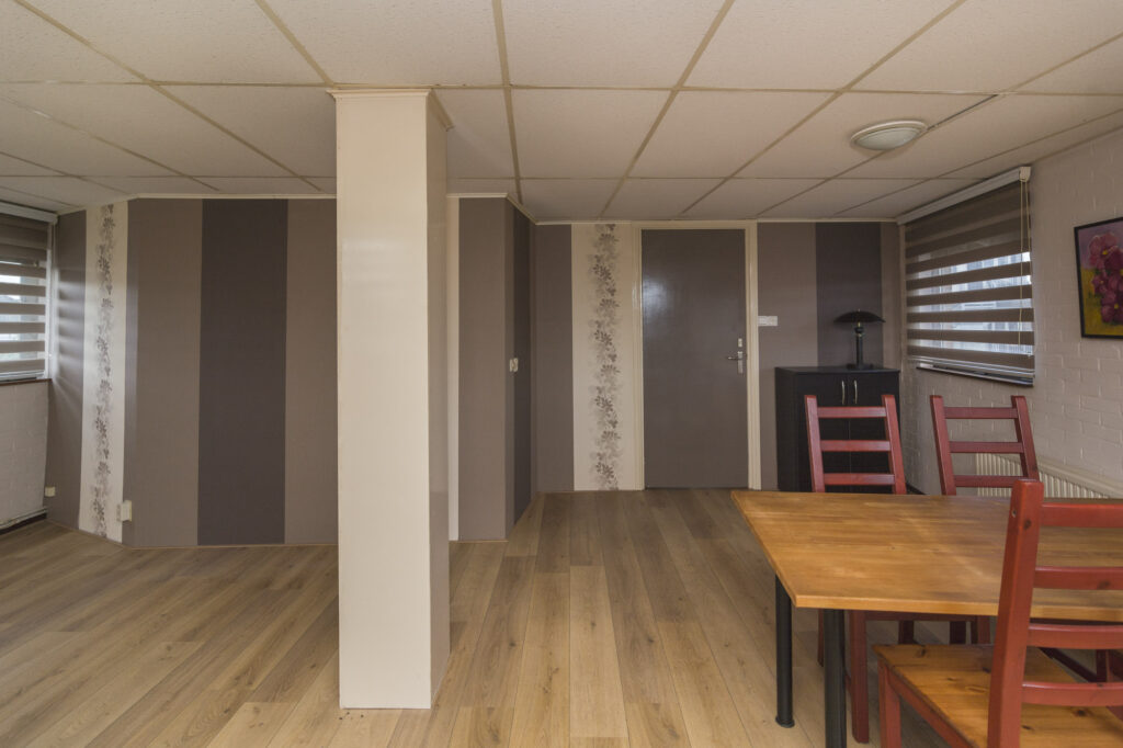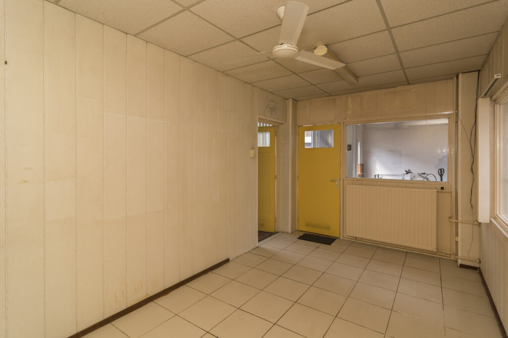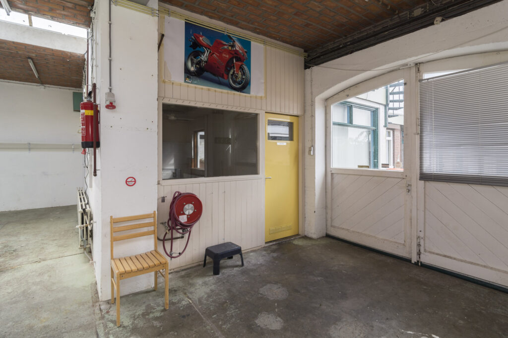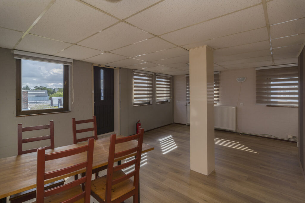 Achter de woning bevindt zich een royale bedrijfsruimte/hobbyruimte van maar liefst ca. 250m² met betonvloer, dubbele deuren en een extra ruimte van ca. 60m². Via een trapopgang is de kantine/kantoorruimte bereikbaar, ook vanuit de buitenzijde. De bedrijfsruimte beschikt over eigen aansluitingen voor gas, elektra (incl. krachtstroom) water en een warmwaterboiler.